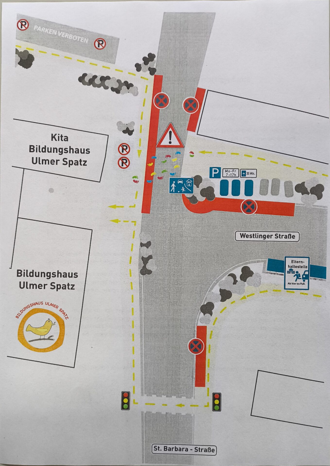 Mit dem Auto: Bitte benutzen Sie die öffentlichen Parkplätze in der Westerlinger Straße und in der St.-Barbara-Straße. Auf den drei Kurzzeit-Parkplätzen in der Westerlingerstraße können Sie kurz parken. Auf den ausgewiesenen Eltern-Haltebuchten gegenüber dürfen Sie nicht parken. Sie dürfen hier Ihr Kind aussteigen lassen und den Platz dann für weitere Eltern frei machen. Ihr Kind kann von hier aus sicher über die Ampel zur Schule gehen.